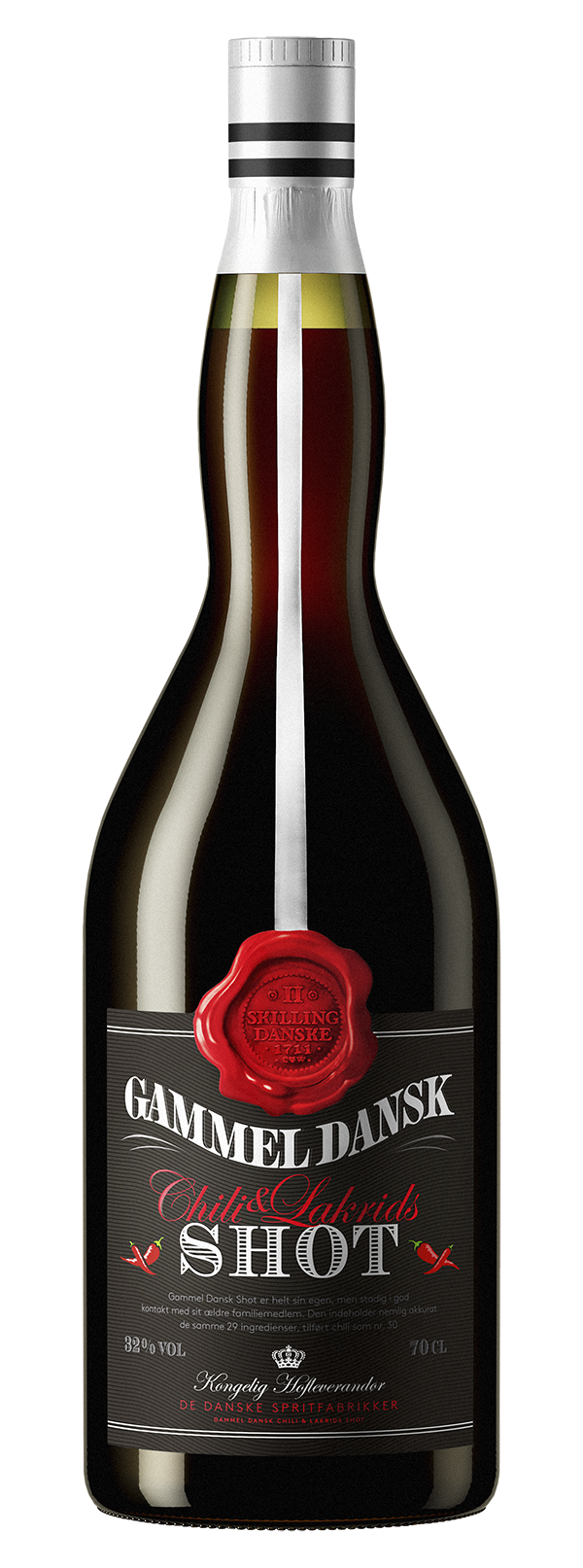 Gammel Dansk Chili & Lakrids Shot är i samma familj som Gammel Dansk Bitter men inte lika utmanande i sin bitterhet. Det är en modern version med tydlig lakrits och chilismak. En trendig shot som har en given plats i baren på krogen eller på förfesten hemma.