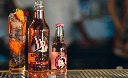 Vad är mer macho än en rosa cocktail? Här ett cocktailrecept på Explorer Pink Gin med smak av jordgubbar och rabarber. Rosa gin & tonic helt enkelt.