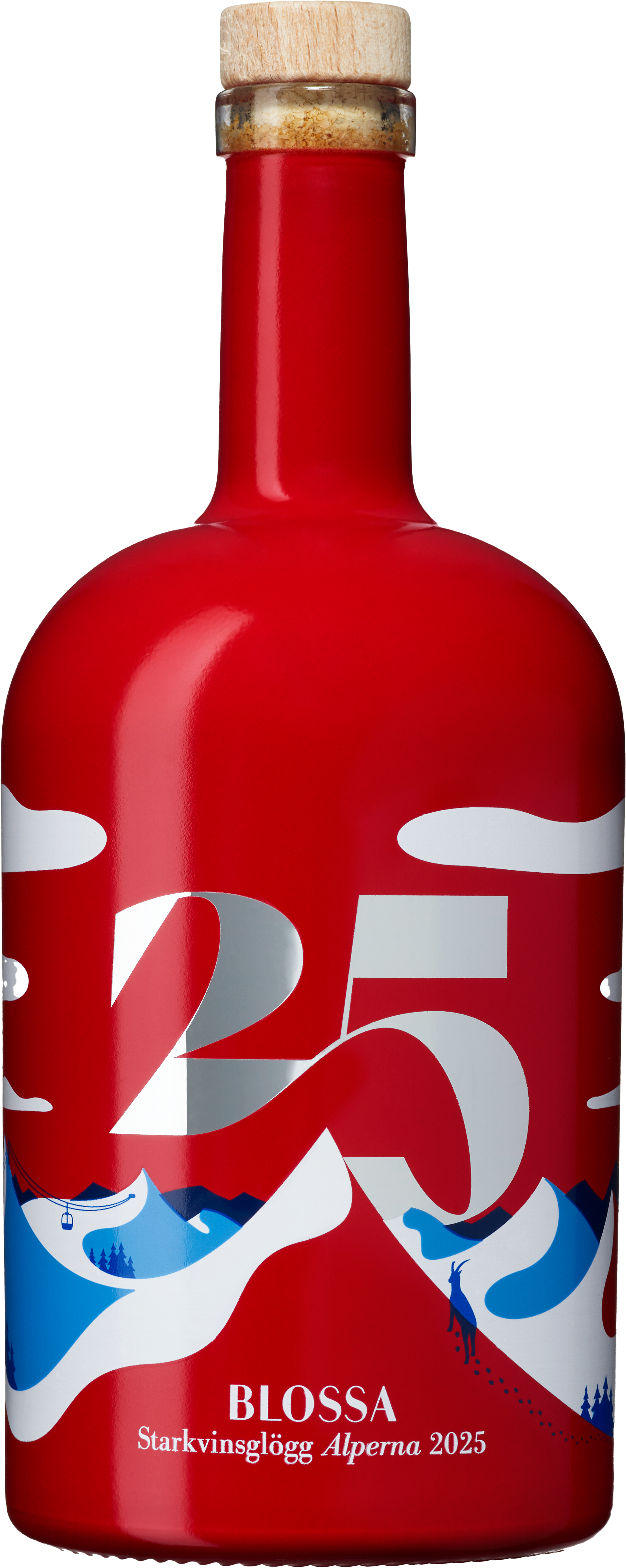 Blossa 25 tar sig över böljande snödalar och barrklädda bergstoppar för att slutligen landa i Alperna. Självklart är därför årets glögg en hyllning till det traditionsenliga glühwein – med en twist signerad Blossa. Detta är därmed vår första årgångsglögg gjord på rödvin, något många av er har frågat efter. Glöggen är framförallt en tolkning av glühwein men får sin karaktär från citronzest, torkade pomeransskal och granskott. Lite enbär har tillsatts för att förhöja smaken av skog. De knallgröna granskotten är vår hyllning till de natursköna och friska alpmiljöerna.