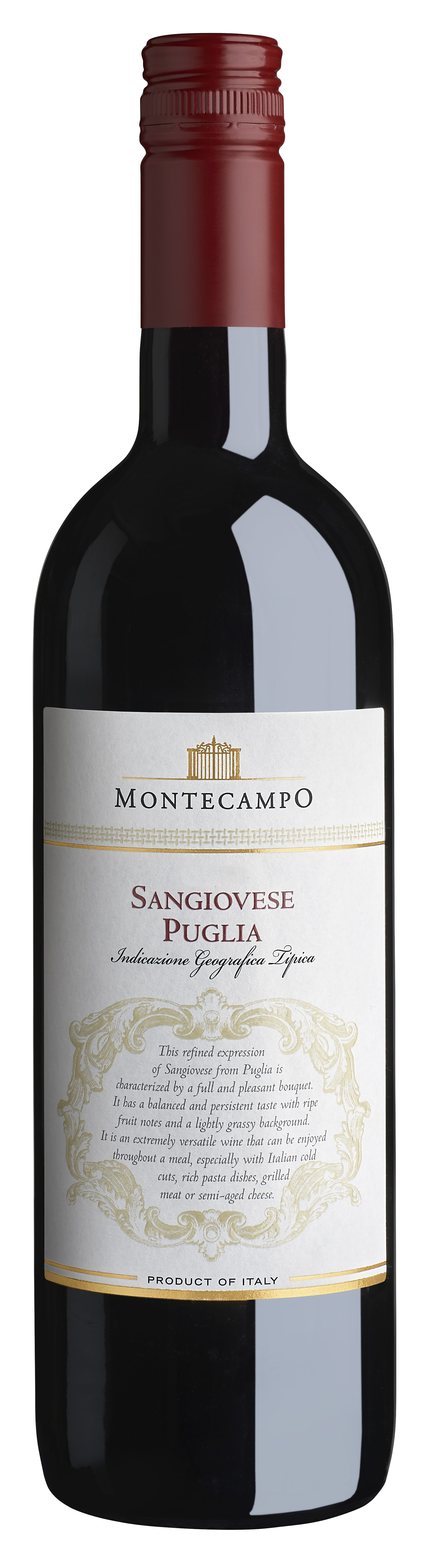 Montecampo Sangiovese Puglia har en trevlig doft med inslag av mörka moreller, blåbär samt färska örtkryddor. Smaken är mjuk med toner av körsbär, örter och pinjenötter.
